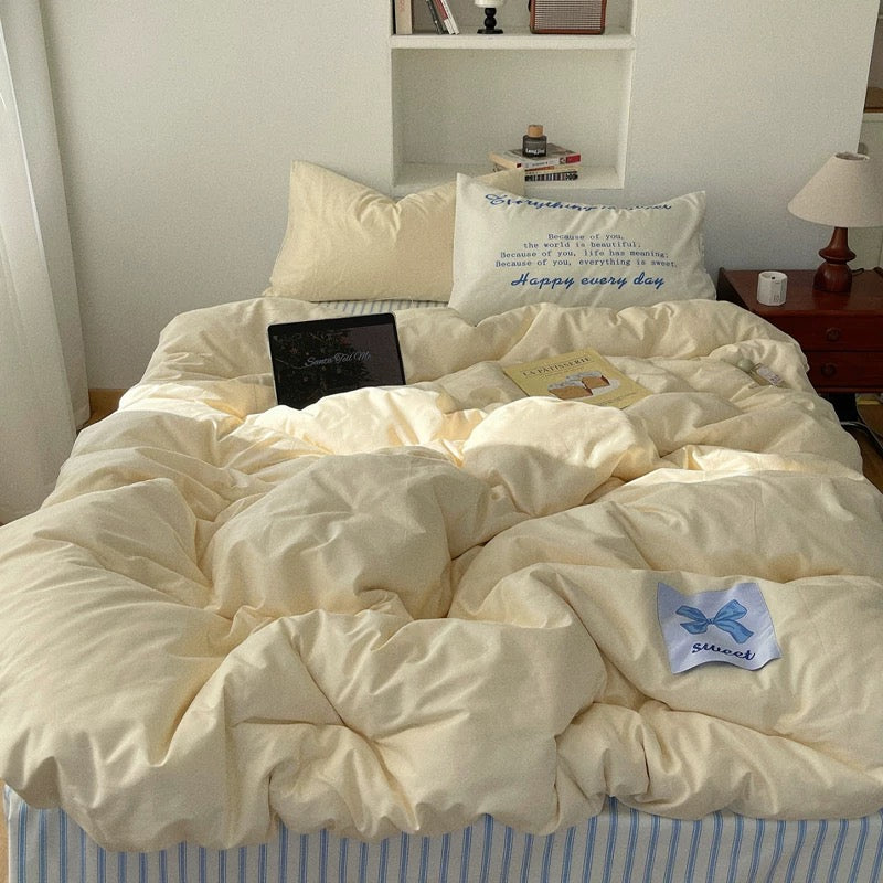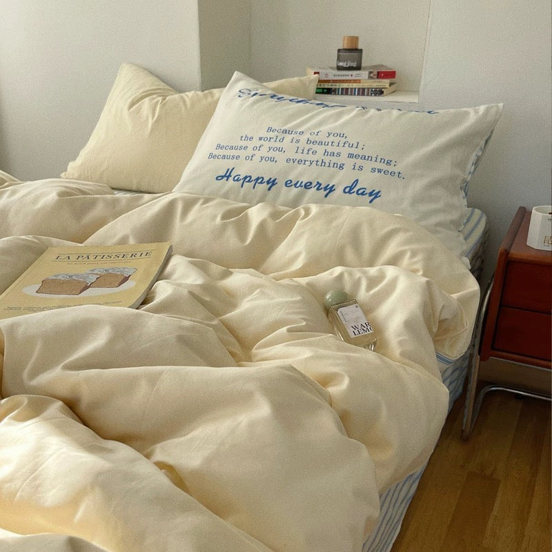 - Queen set with 200cm*230cm duvet cove, 245cm*250cm flat sheet, and (2) 48cm*74cm pillowcases