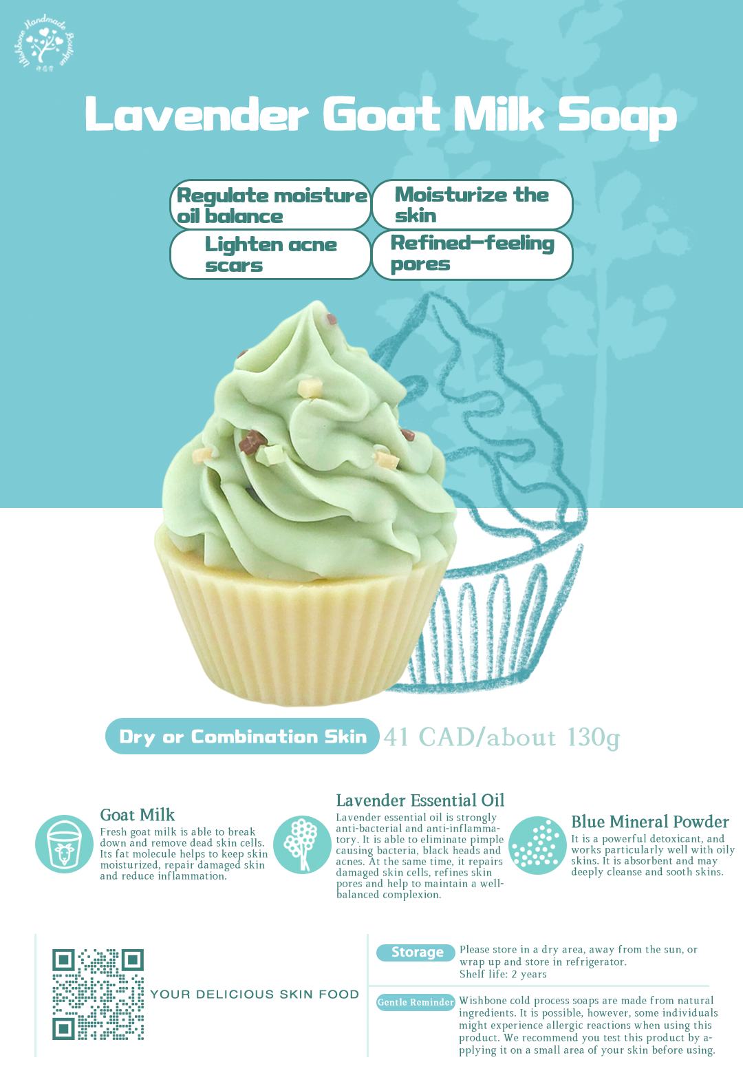 Main Ingredients:Olive Oil, Coconut Oil, Spring Water, Goat Milk, Palm Oil, Castor Oil, Shea Butter, Lavender Essential Oil, Blue Mineral Powder.
