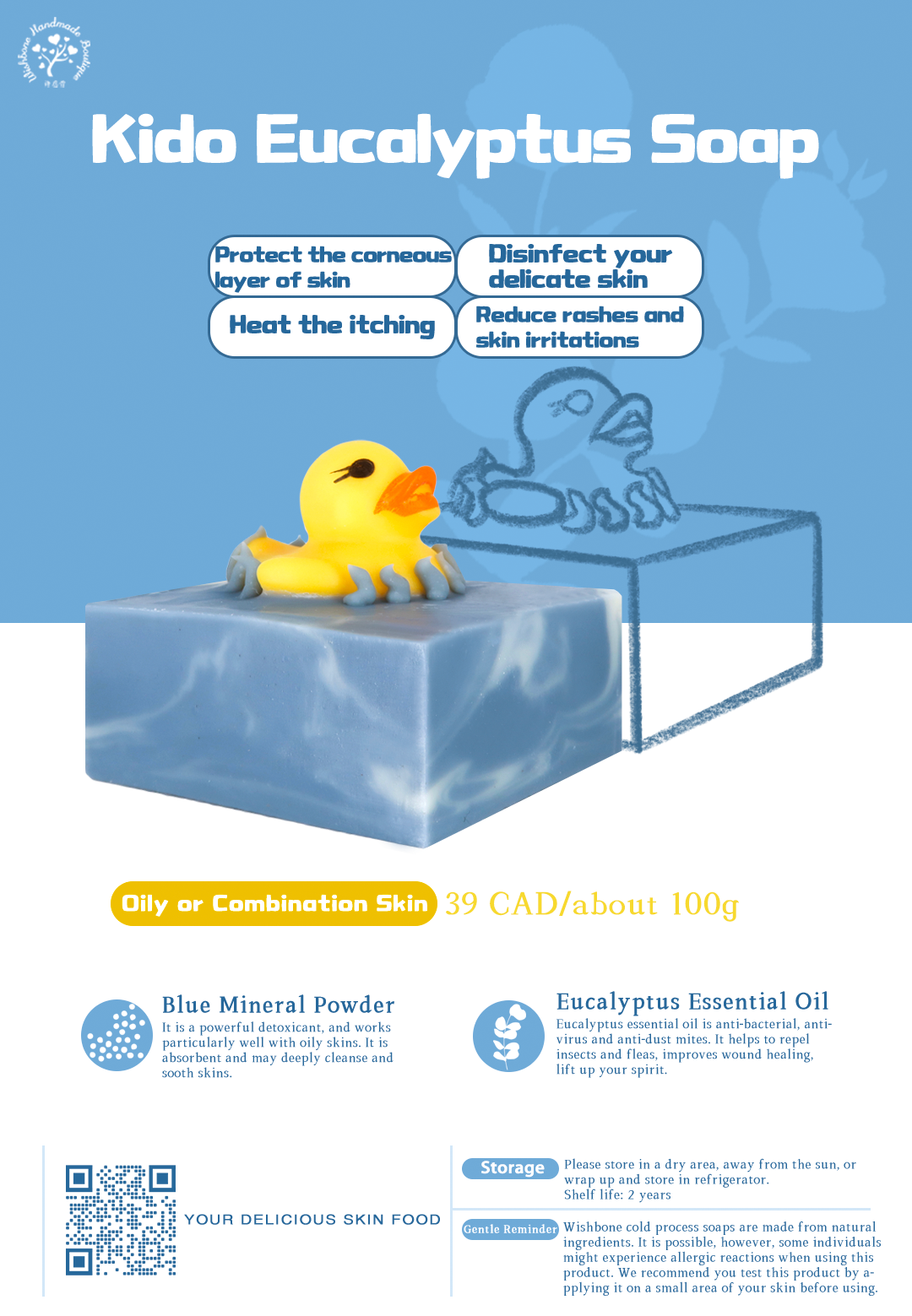 Main Ingredients:Olive Oil, Spring Water, Coconut Oil, Palm Oil, Soy Oil, Blue Mineral Powder, Eucalyptus Essential Oil.