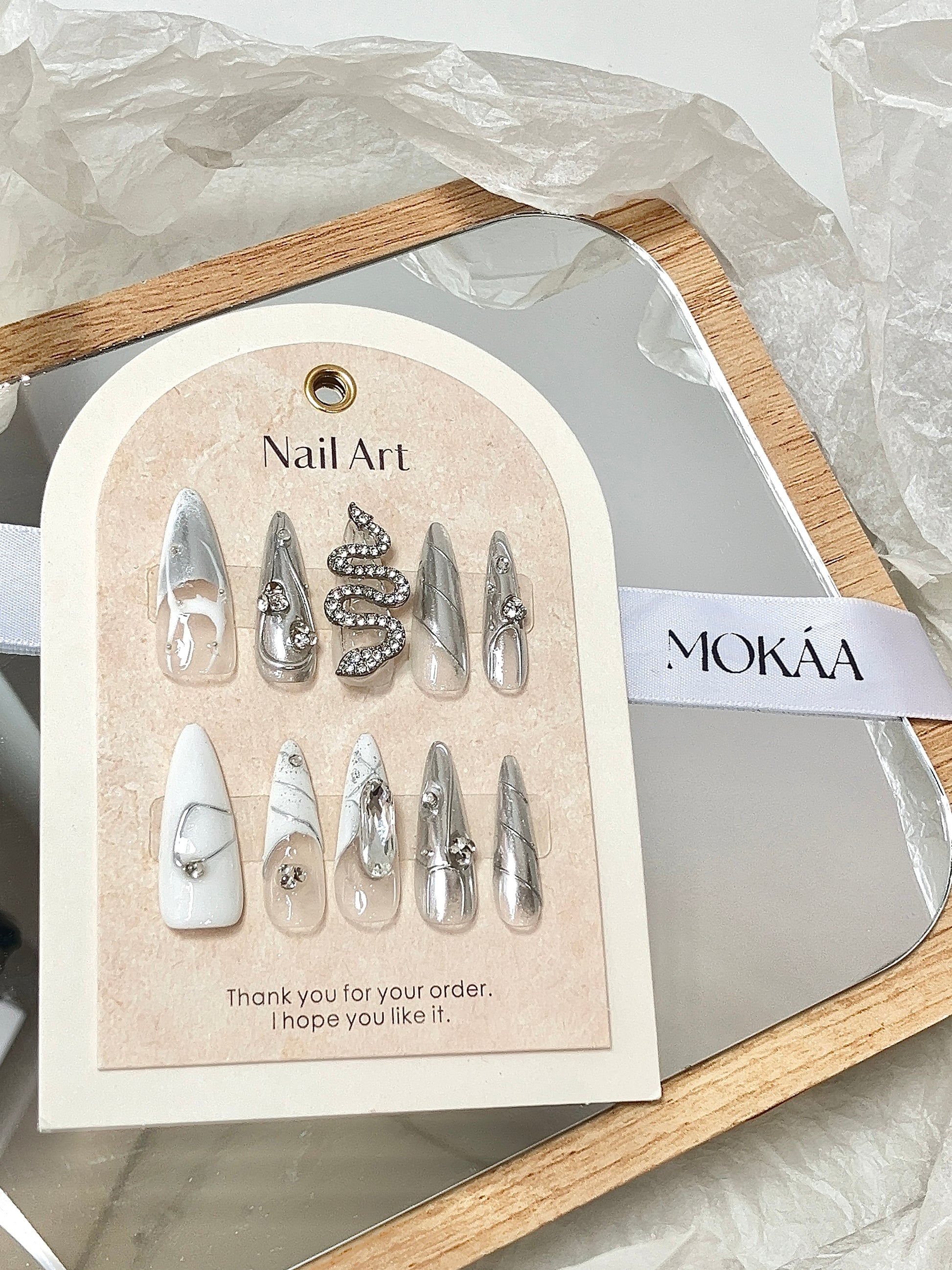 includes nail glue, 24 adhesive tabs (1 sheet), a cuticle wooden pusher, a mini file, and alcohol wipes.